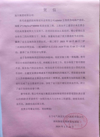2024年元月25日,東方電氣集團(tuán)東方汽輪機(jī)有限公司向第四公司魯麗項(xiàng)目部發(fā)來(lái)了賀信。東汽項(xiàng)目經(jīng)理?xiàng)詈秊榈蠣柤瘓F(tuán)第四公司魯麗項(xiàng)目部頒發(fā)了“鐵軍風(fēng)采,使命必達(dá)”榮譽(yù)證書(shū)。