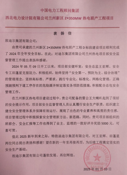 蘭州新區(qū)熱電項(xiàng)目部安全工作獲嘉獎(jiǎng)
